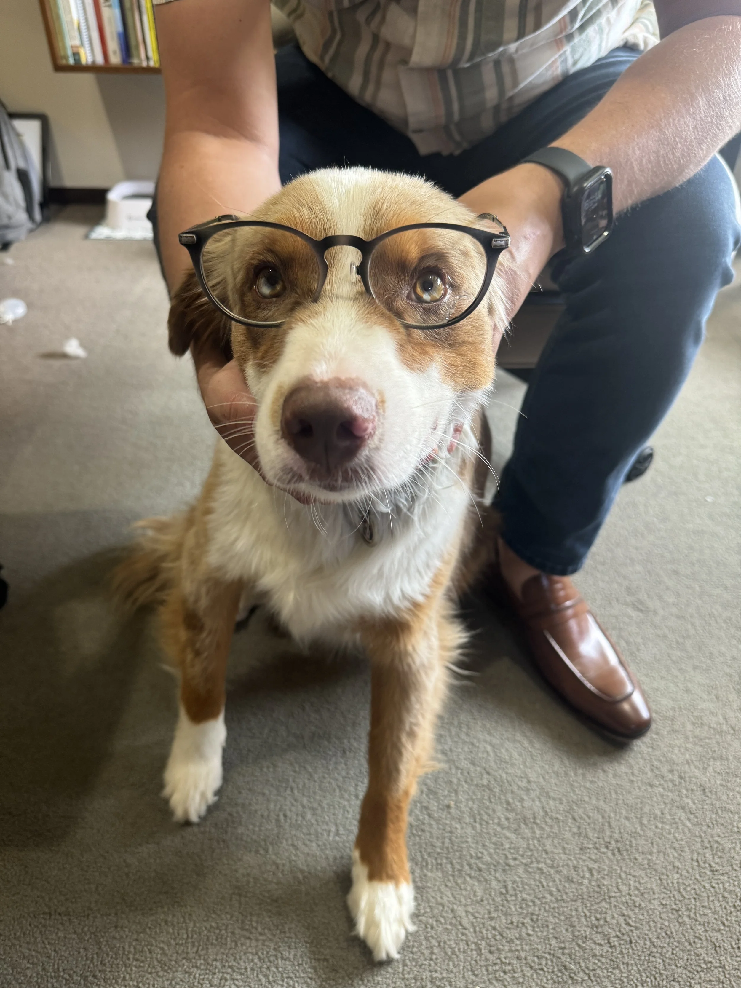 Iroh began his professional career as a Therapy Dog in July, 2023. Working on a part-time basis, he often greets clients with his trademark tail-wagging and happily receives pets for being a good boy.
